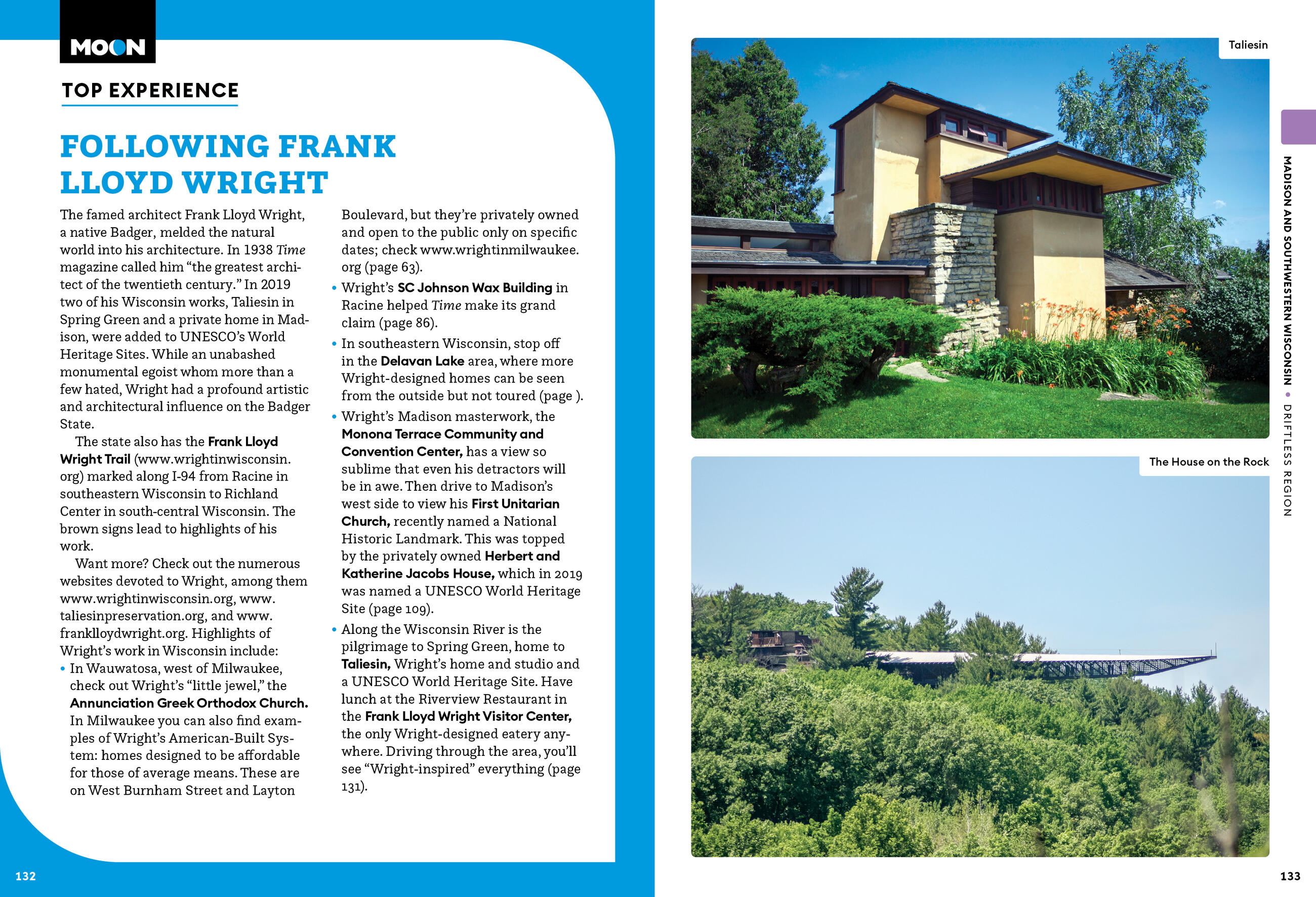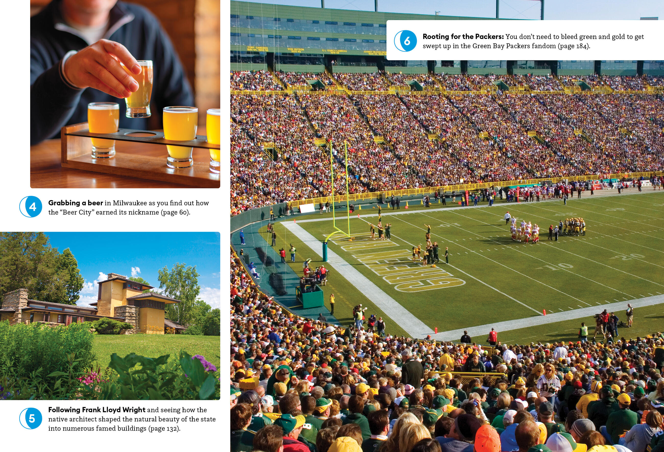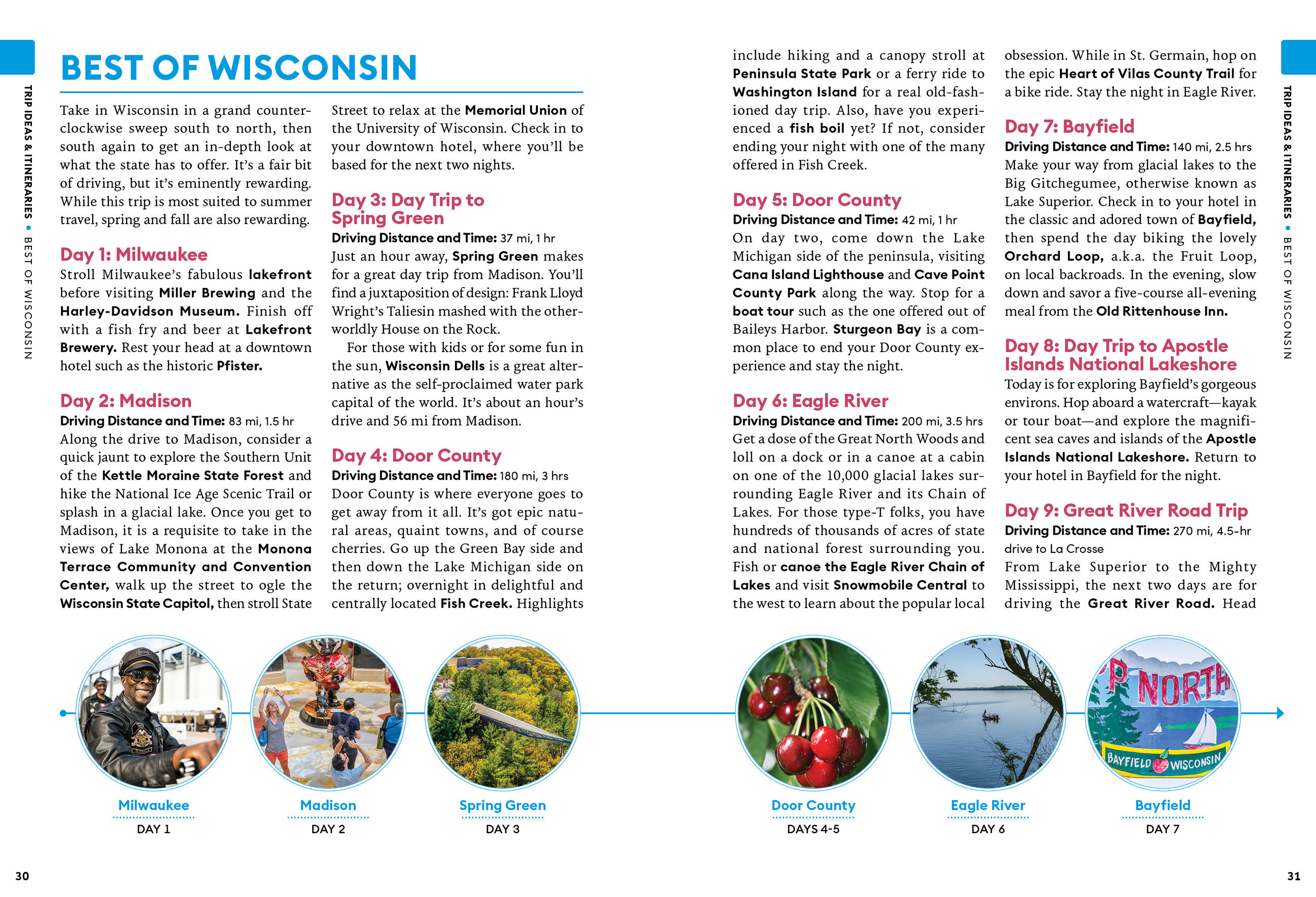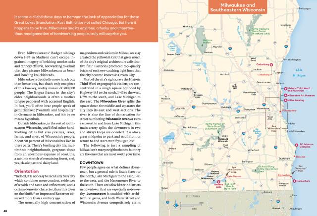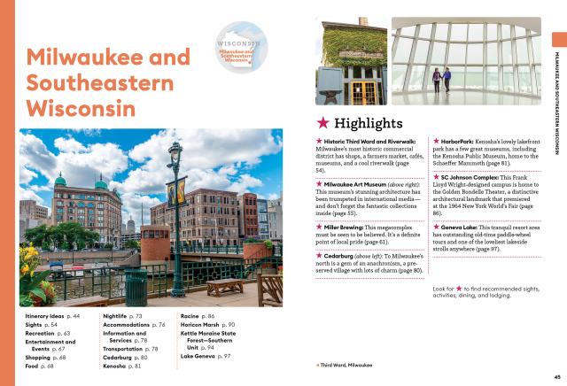 - Strategic itineraries, from a weekend in Milwaukee or Madison to a 10-day trip exploring the best of the state, with advice for architecture buffs, foodies, families, outdoor adventurers, and more