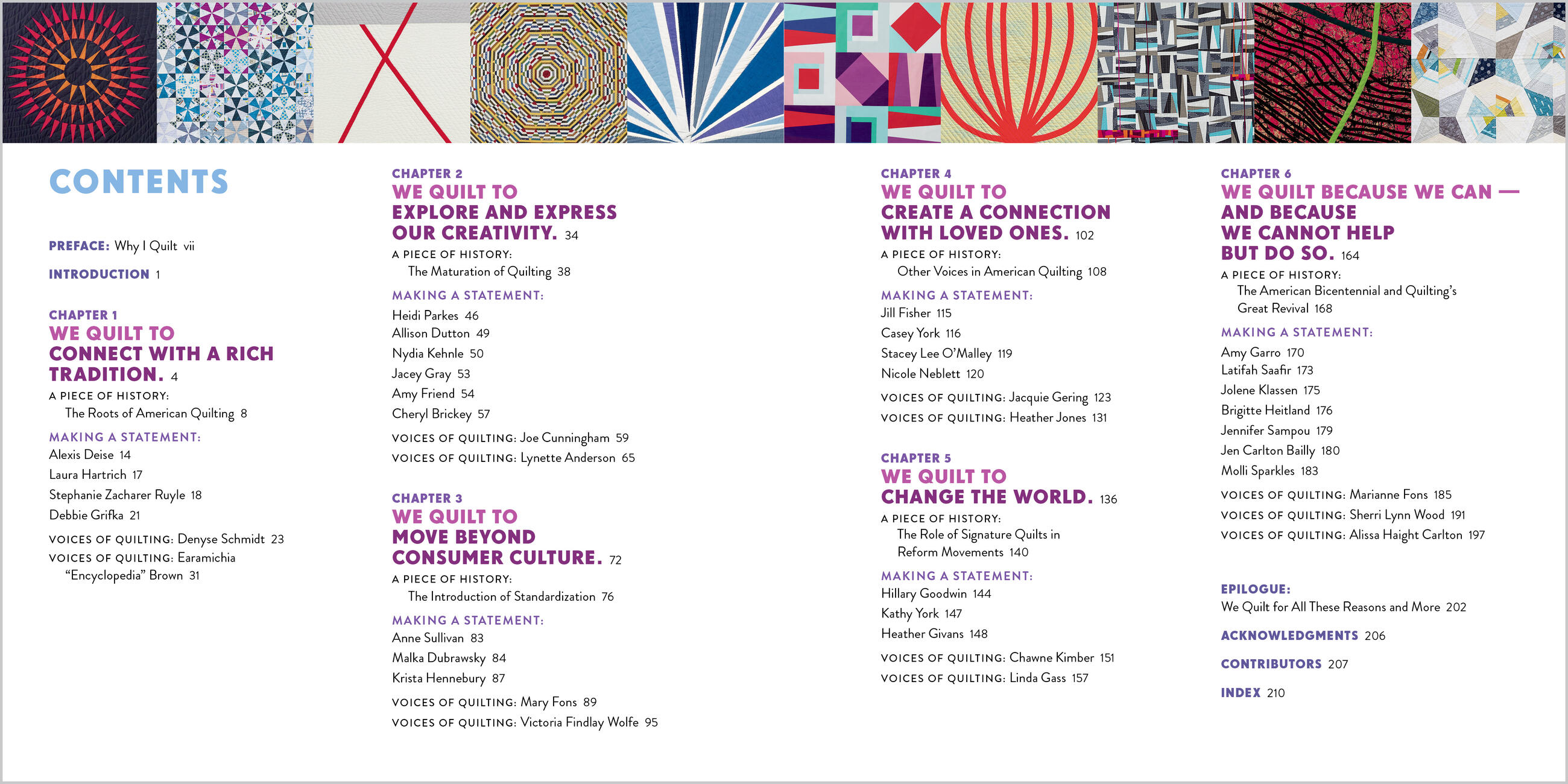 “Why We Quilt beautifully highlights some of the leading quilters of our time, stitching connections between their work and the rich history of quilting that we cannot help but be grounded in. This book reminds me, as a quilter and the owner of a local quilt shop, that what we create — alone or in shared spaces, for whatever reason — is important. Our handwork, our stories, our quilt dreams are powerful and meaningful.” — Virginia B. Johnson, owner, Gather Here