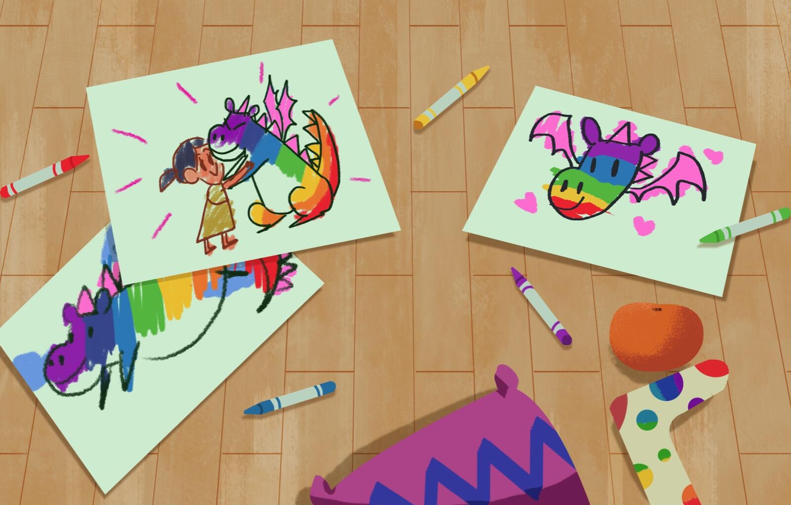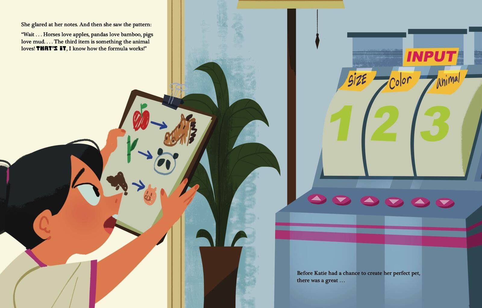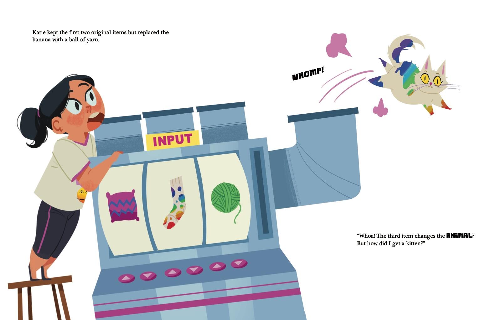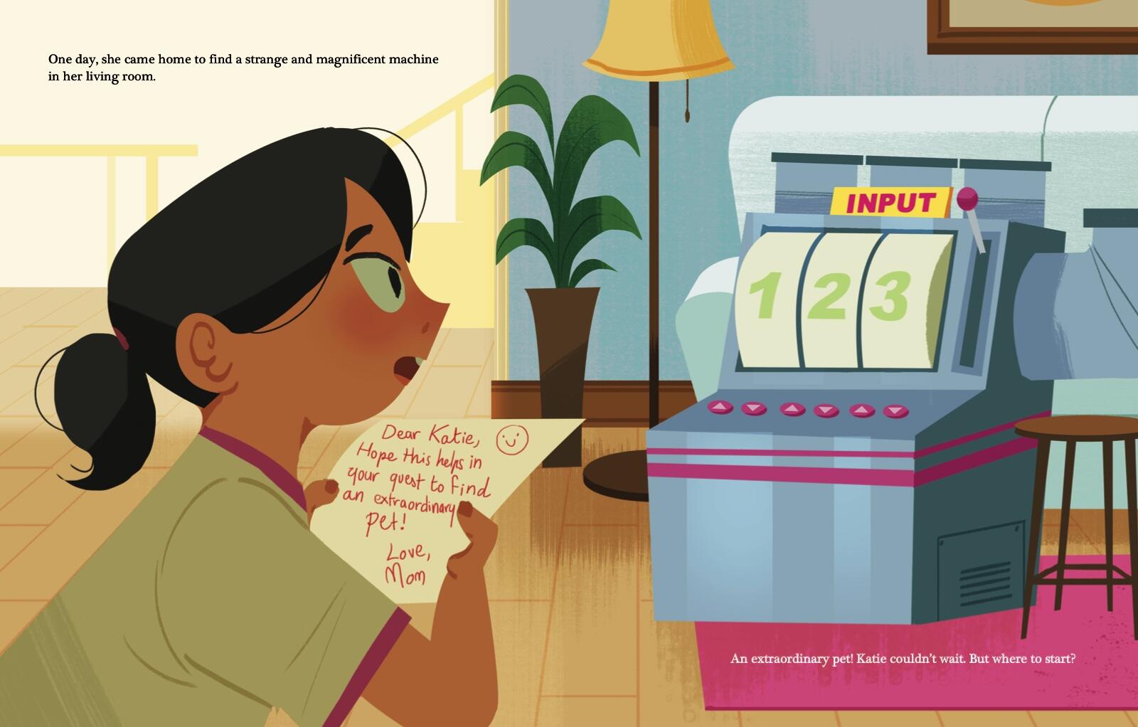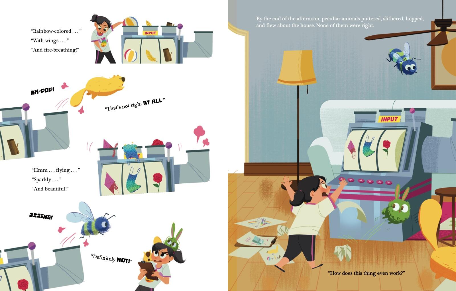 Katie is an ordinary girl who longs for an extraordinary pet—something more spectacular than a simple goldfish. Then one day Katie comes home to find a gift from her mother: a mysterious machine designed to help her create that one-of-a-kind creature. Each time she feeds different items into the machine, out comes a marvelously colorful new animal—like a purple monkey, rainbow-spotted horse, and green bunny! But none of them is just right. Through trial and error, Katie figures out the formula for her absolutely perfect SURPRISE pet.