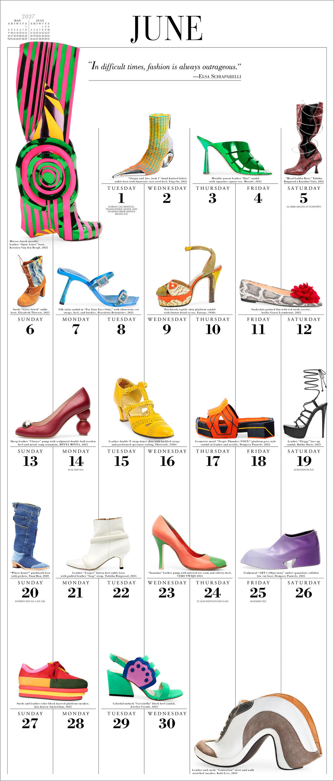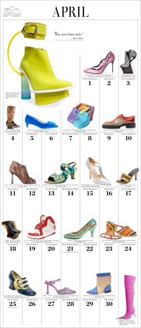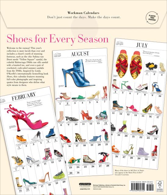 - FEED THE FOOTWEAR OBSESSION: A closet full of shoes in a 12” x 14” calendar. Slides, pumps, sneakers, mules, stilettos, and more every month.