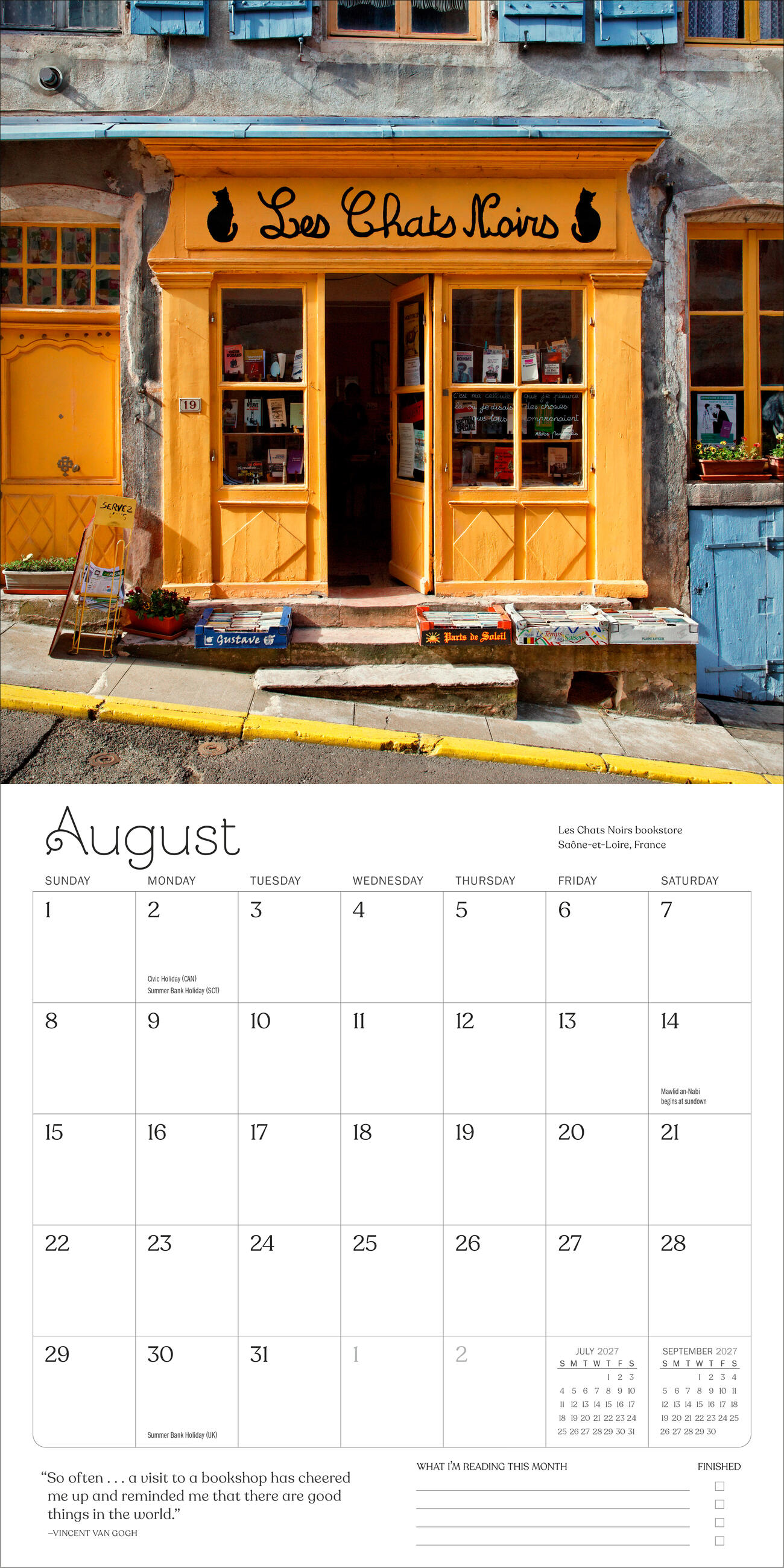 - BOOKISH BEAUTY: Each month highlights places dedicated to books, from grand libraries to cozy bookstores. Gorgeous photography is paired perfectly with quotes about the joys of books and reading.