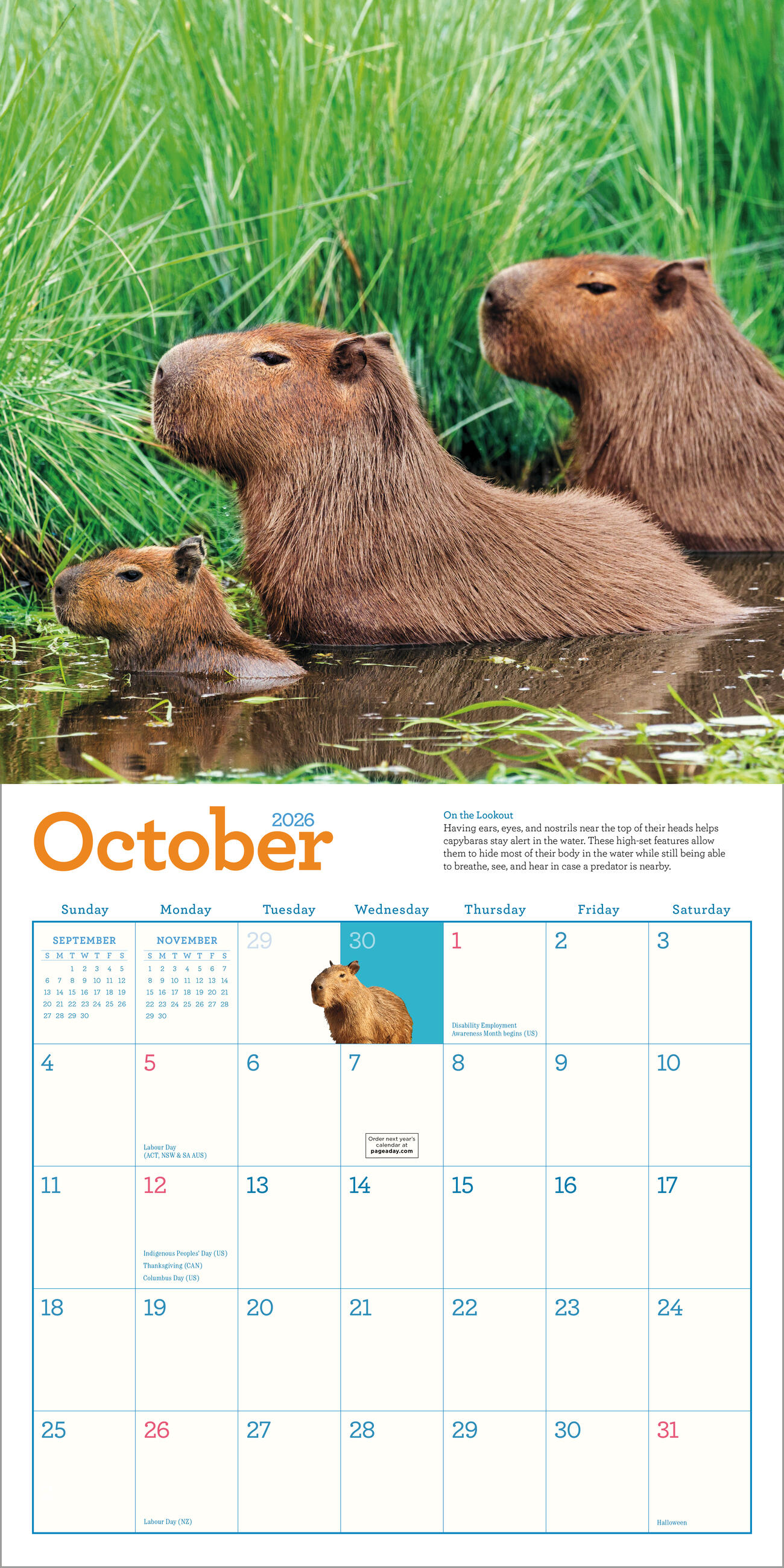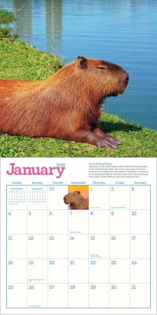 - CAPTIVATING CAPYS: Twelve months of amazing full-color capybara photos taken in their beloved natural habitats, accompanied by a fun capy fact so you can learn more about these awesome animals.