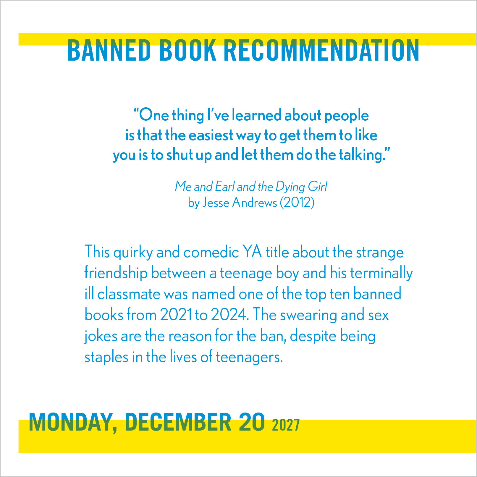 - STAND WITH THE BANNED: Dozens of essential literary works have been threatened by censorship in recent years. Stand up for free speech with this new calendar that celebrates the wisdom, lessons, and humor found in these important, entertaining, and impactful books.