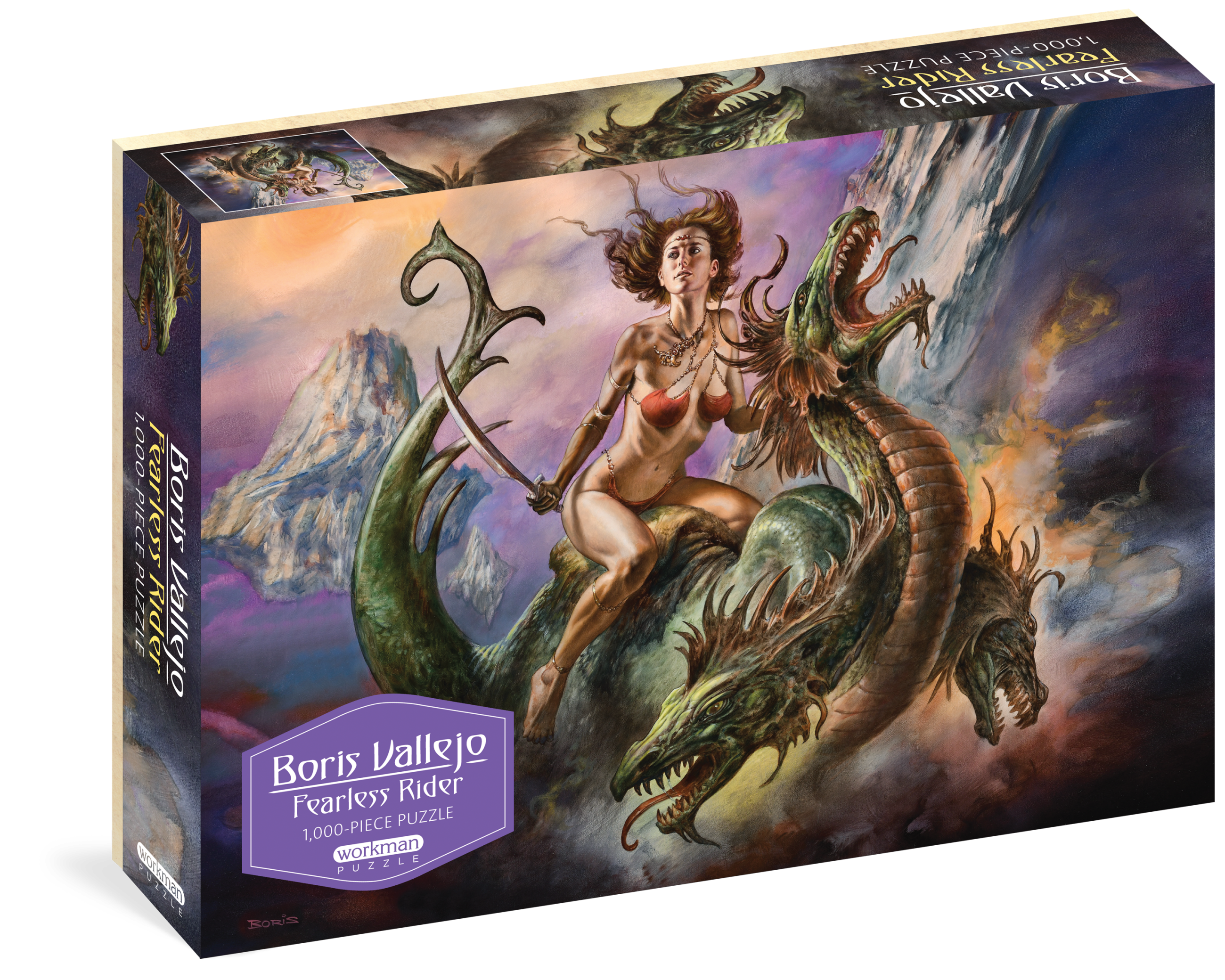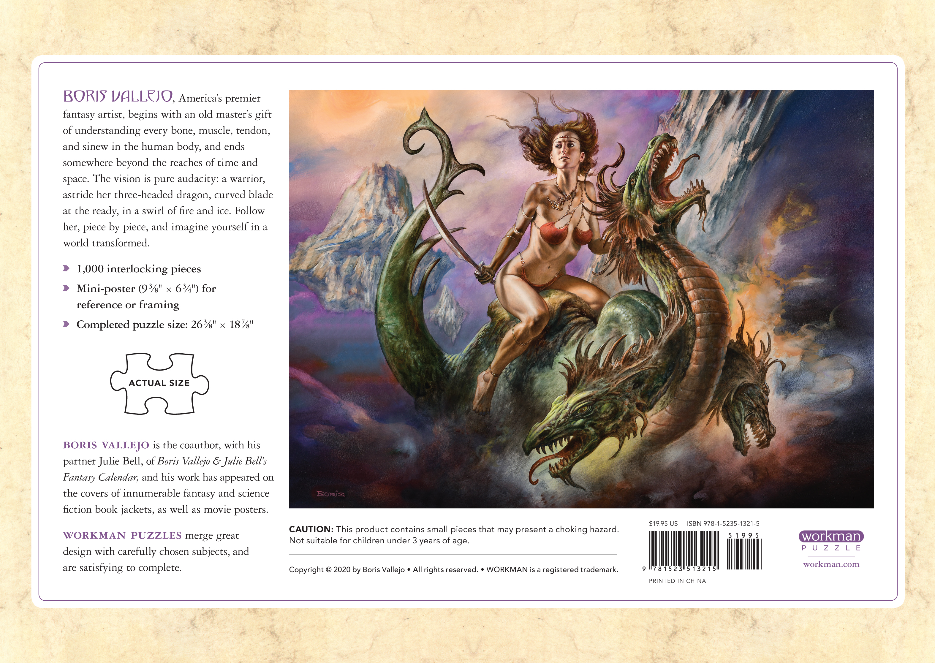 Boris Vallejo begins with an old master’s gift of understanding every bone, muscle, tendon, and sinew in the human body, and ends somewhere beyond the reaches of time and space. The vision is pure audacity: a warrior astride her three-headed dragon, curved blade at the ready, in a swirl of fire and ice. Follow her, piece by piece, and imagine yourself in a world transformed.
