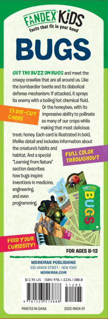 Learn about the bombardier beetle and its diabolical defense mechanism: If attacked, it sprays its enemy with a boiling hot chemical fluid. Or the honeybee, with its impressive ability to pollinate so many of our crops while making that delicious treat: honey. Each card is illustrated in bold, lifelike detail and includes information about the creature’s habits and habitat. And a special “Learning from Nature” section describes how bugs inspire inventions in medicine, engineering, and even programming!