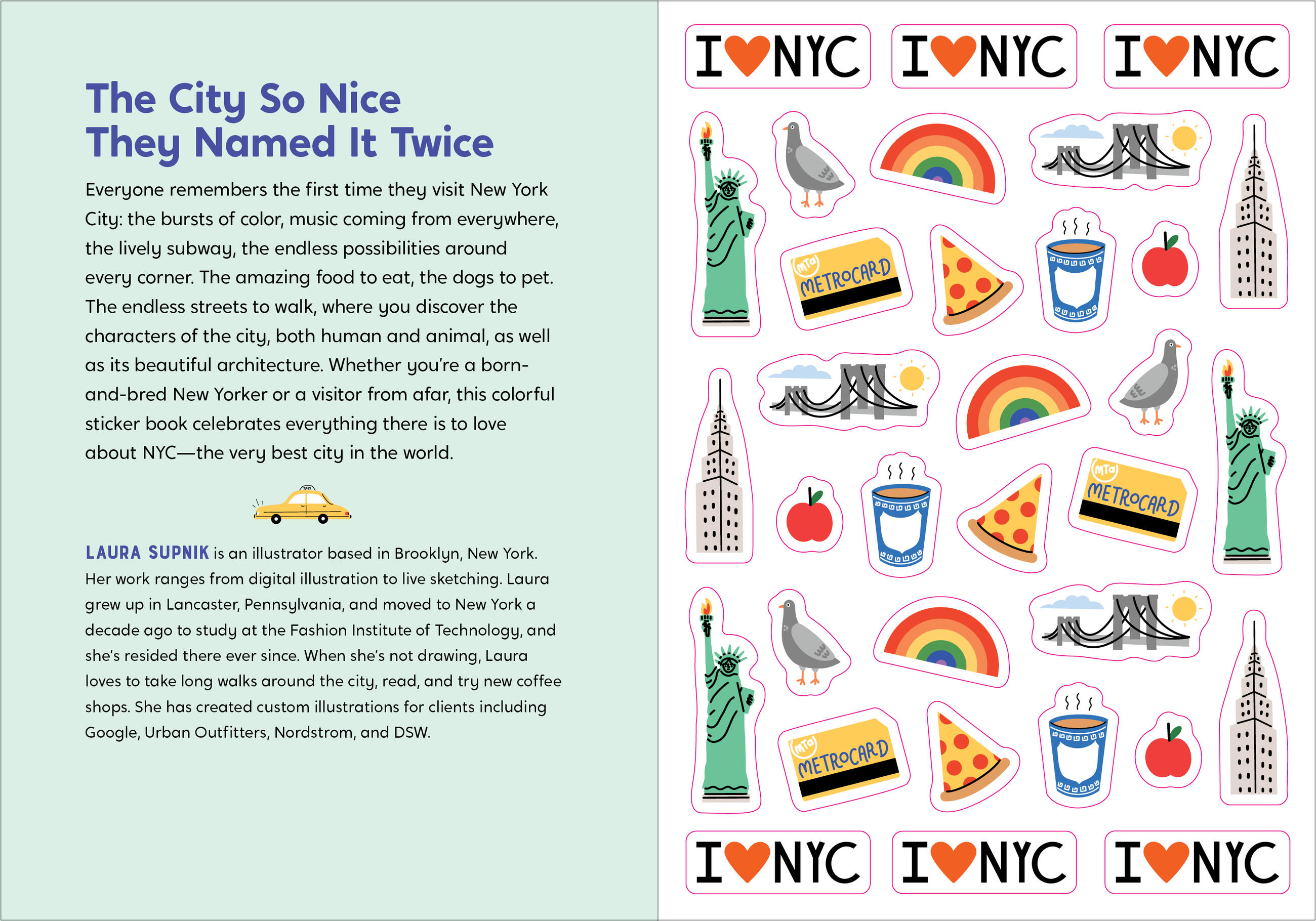 I Love New York City Sticker Book is a fun and colorful visual celebration of the Big Apple. Filled with 300+ stickers illustrated by local artist Laura Supnik, the book includes everything from yellow taxi cabs, the shining lights of Broadway, and our lovable pigeon and rat friends to all of the city’s boroughs and best-known landmarks (think Empire State Building, the Brooklyn Bridge, Staten Island Ferry, the Unisphere).