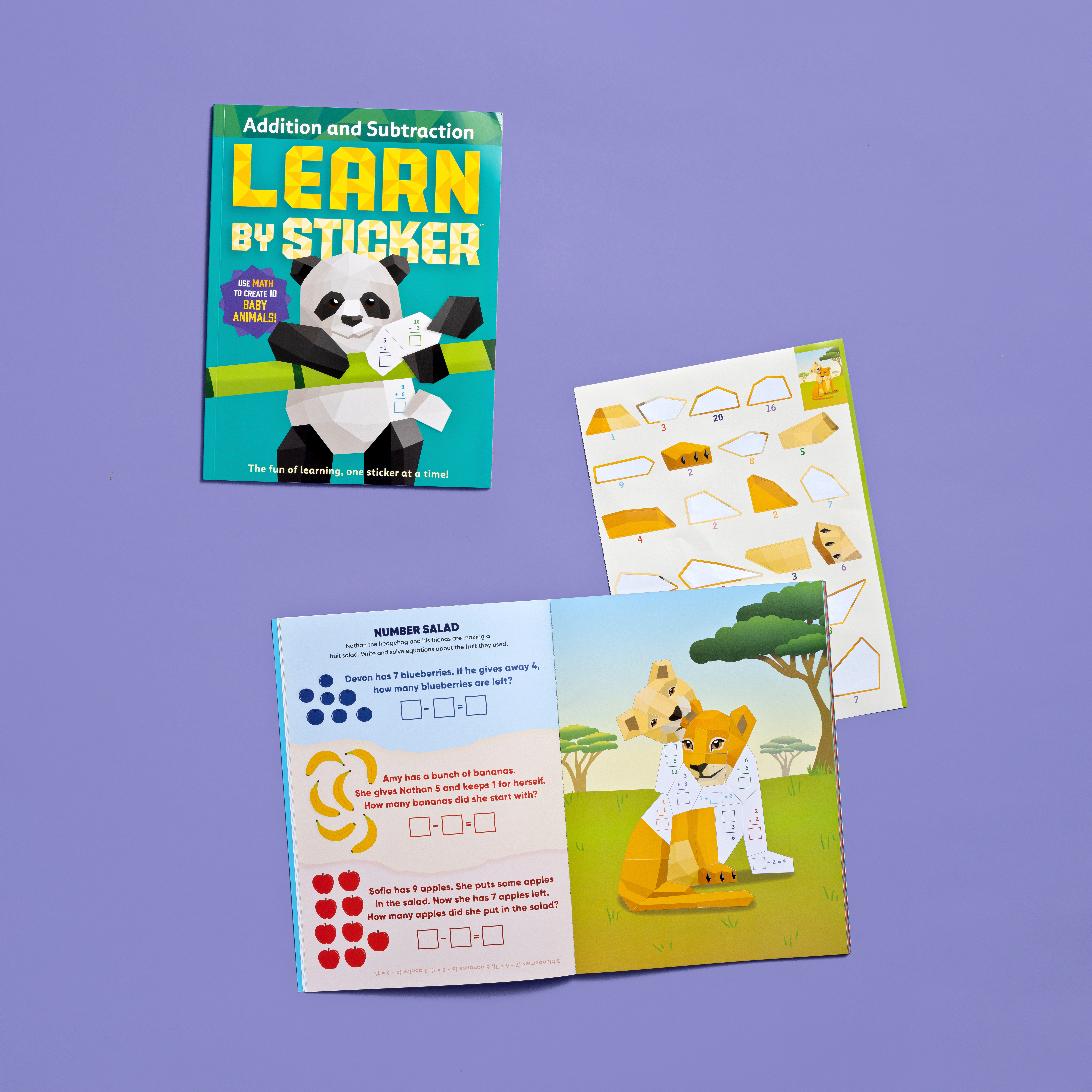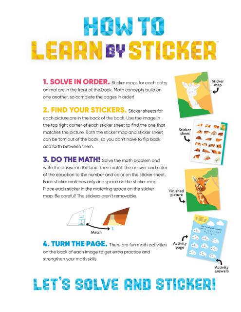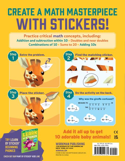 In Learn by Sticker: Addition and Subtraction, solve first grade-level addition and subtraction problems and use the answers to determine where to place each sticker to create ten sticker images of beautiful baby animals. Plus, the back of each sticker page contains fun, critical thinking-based math activities like solving riddles, decoding secret messages, and more.