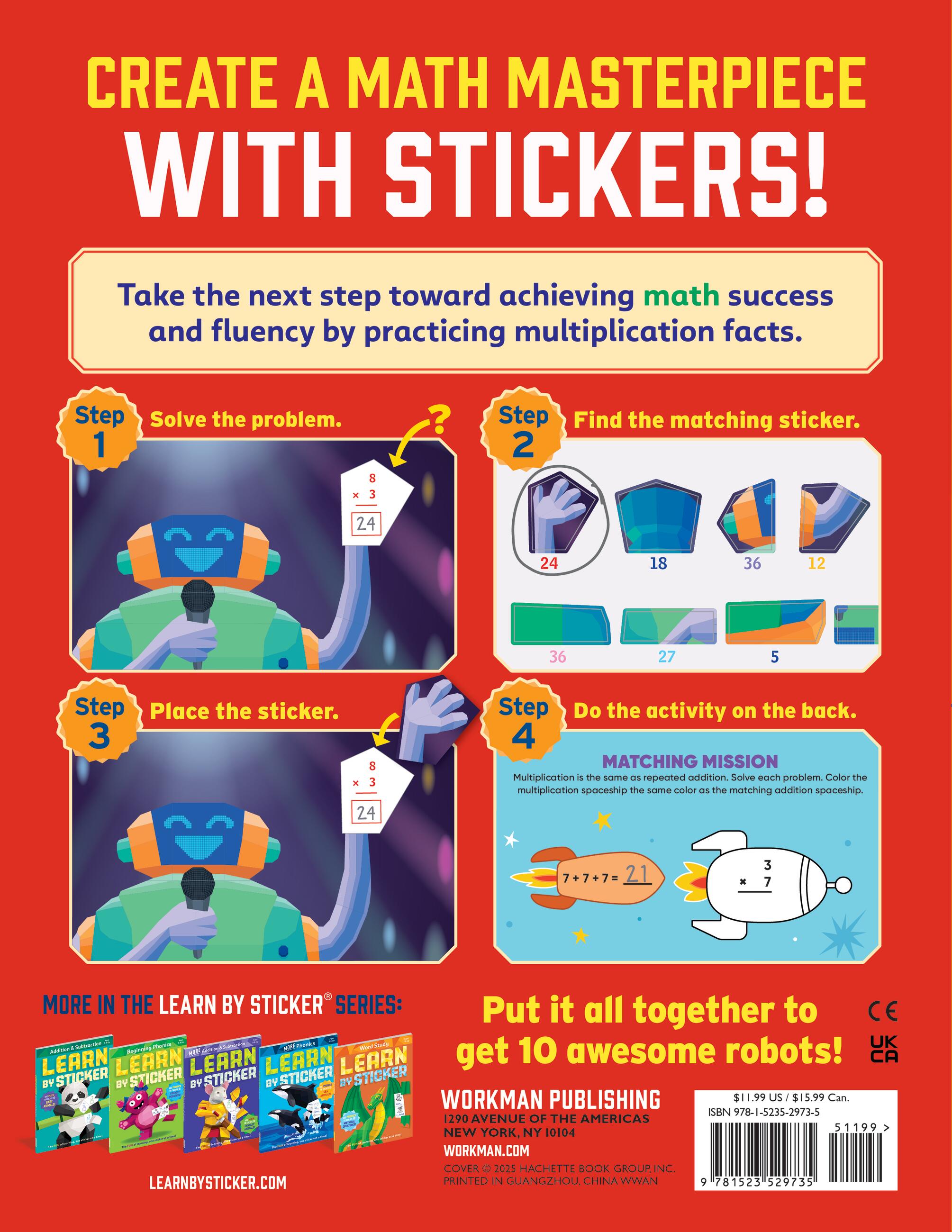 In Learn by Sticker: Multiplication, solve third grade-level multiplication problems and use the answers to determine where to place each sticker to create ten sticker images of supercool robots. Plus, the back of each sticker page contains fun, critical thinking-based math activities like solving riddles, exploring mazes, and more.