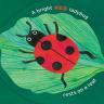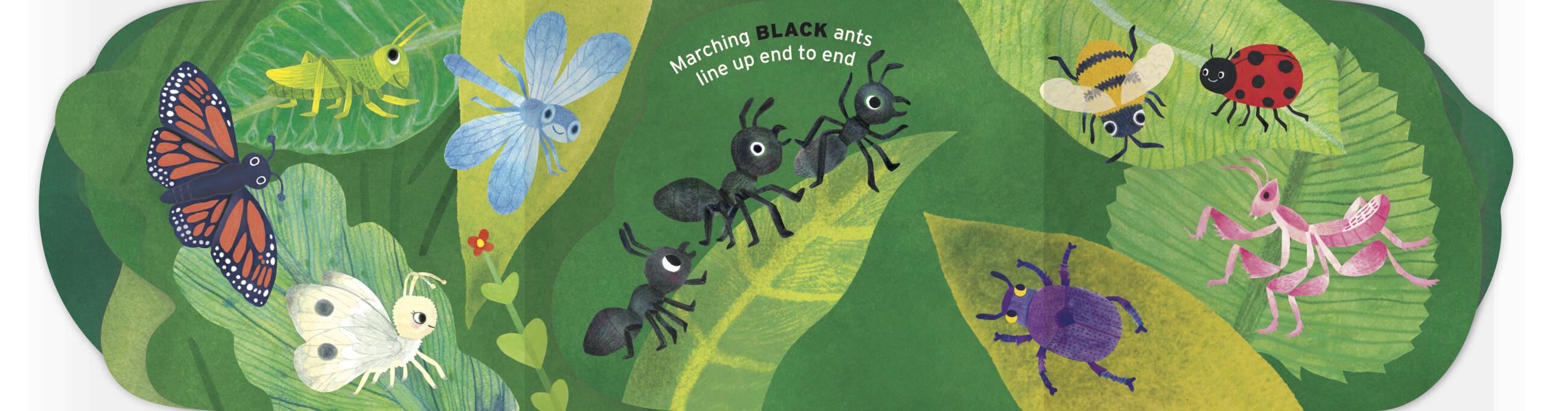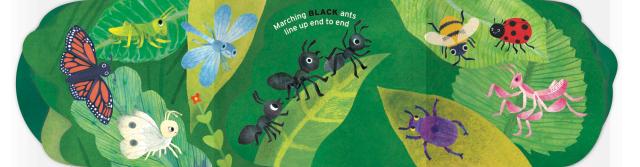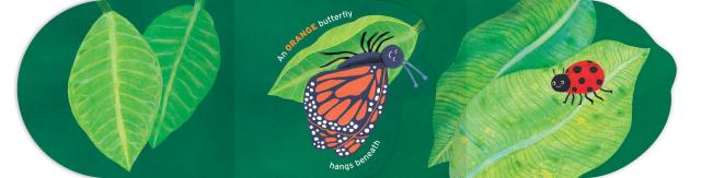 A unique format, this board book has two spines—one on each side. Every other page attaches to the opposing spine so that the book opens outward left and right. As the the reader turns the pages (each die-cut in the shape of a leaf), a new colorful bug appears.